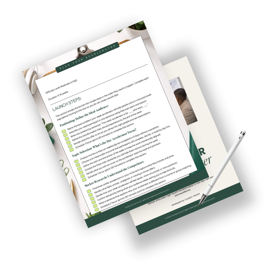 A Day Accelerator is a high-focus experience that helps a client solve one clear problem and leave with a real result by the end of the day. It allows you to go deeper with fewer clients, in less time, without committing to long, draining engagements. The Day Accelerator Launch Organizer helps you design the full experience with structure from start to finish, including the outcome, what is included and not included, the flow of the day, the assets your client will leave with, and the sales and delivery setup that keeps your workflow organized and easy to run.